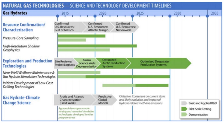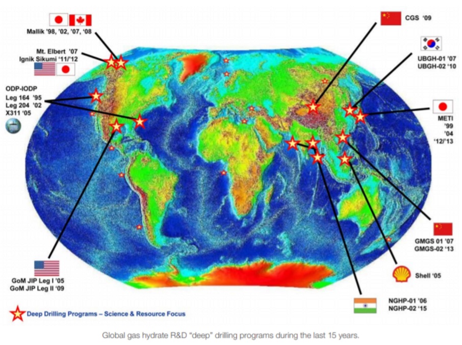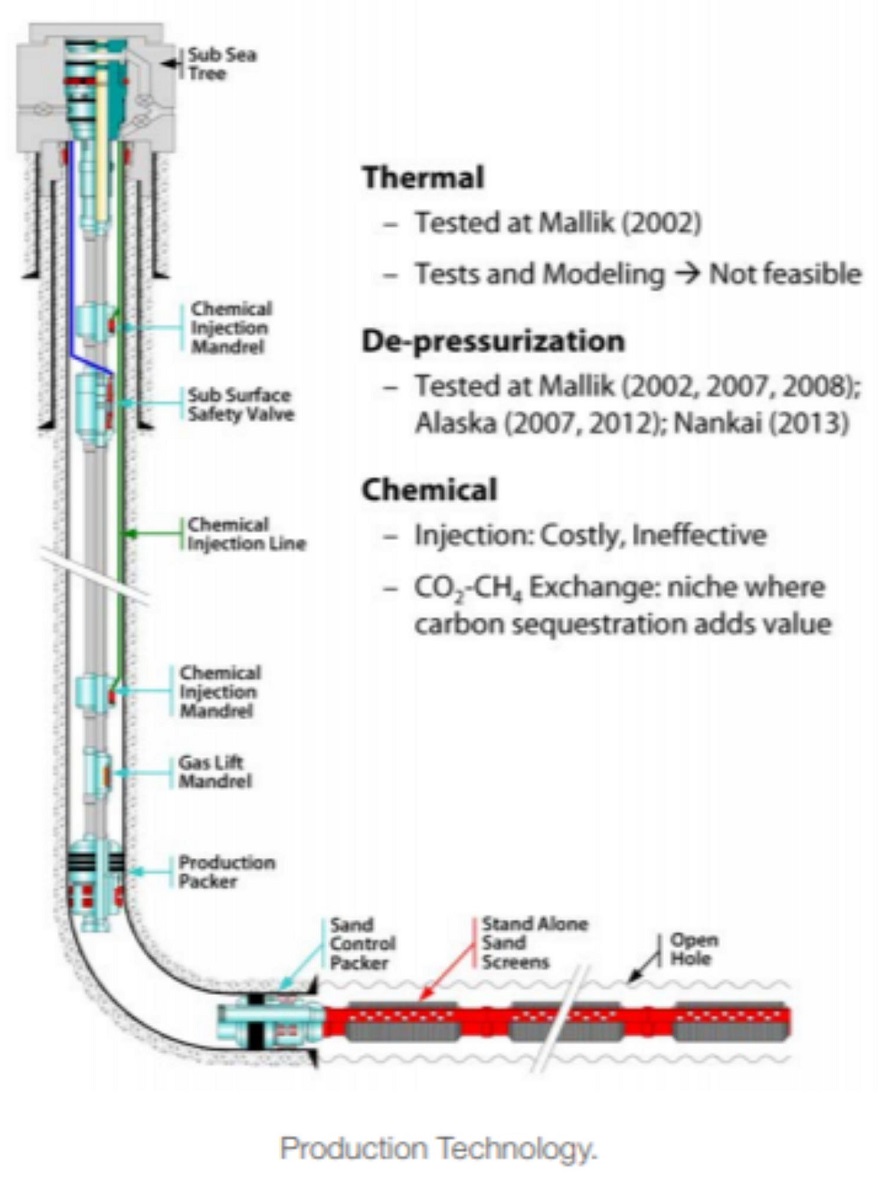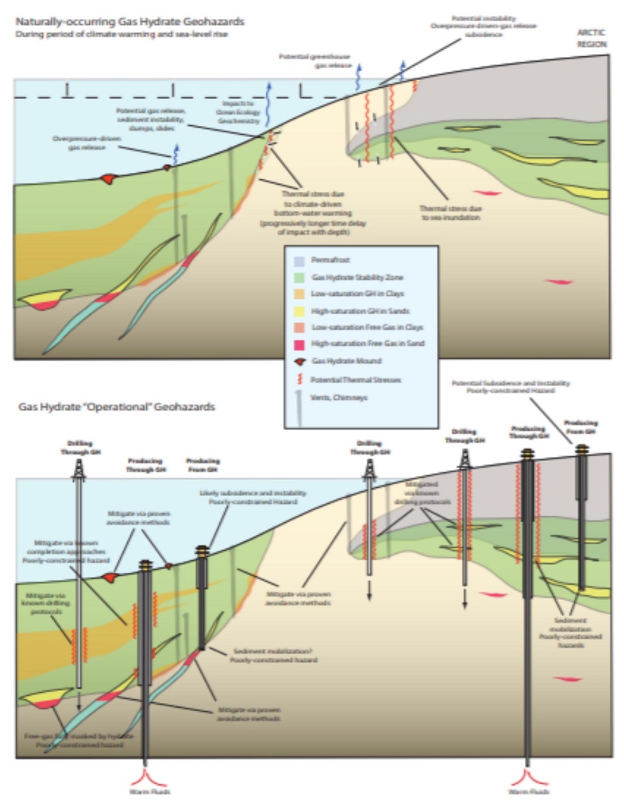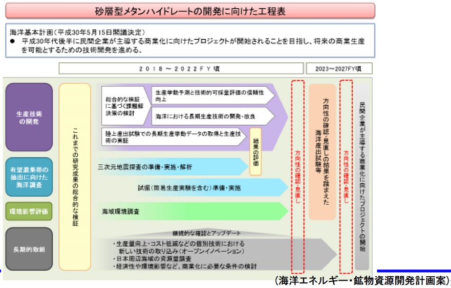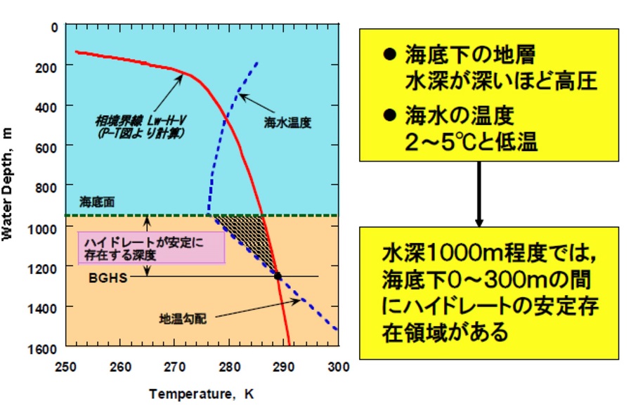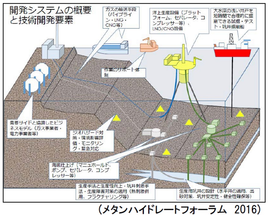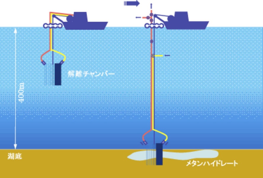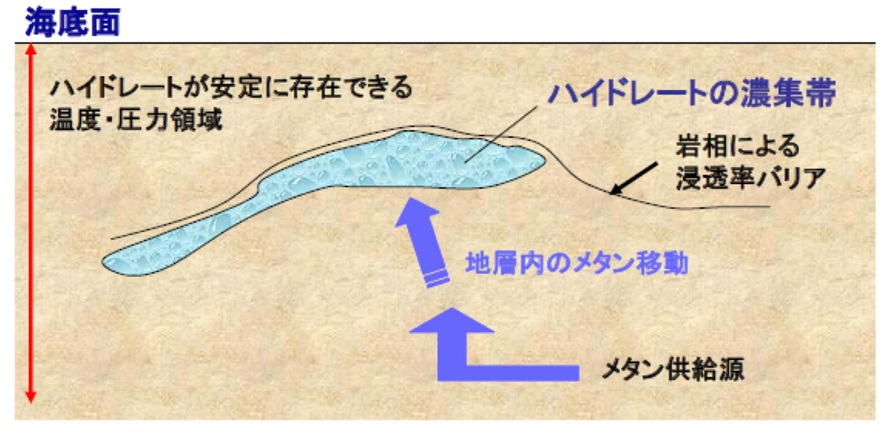 採集方法は、結局のところ、在来型の資源である石油や天然ガスを採集するように、縦坑を掘ってパイプを突き刺して、採集を図る…という方法が、最も現実的、ということになる。
