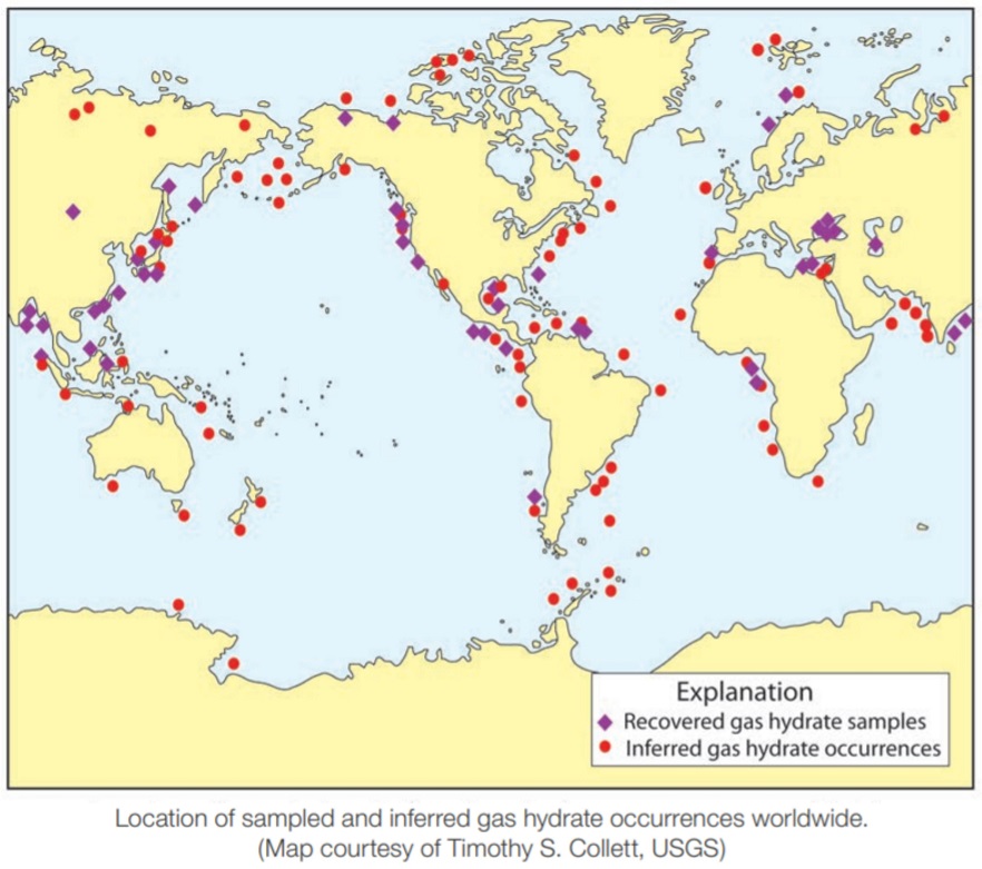 次は、世界のメタンハイドレートの推定分布のマップ。