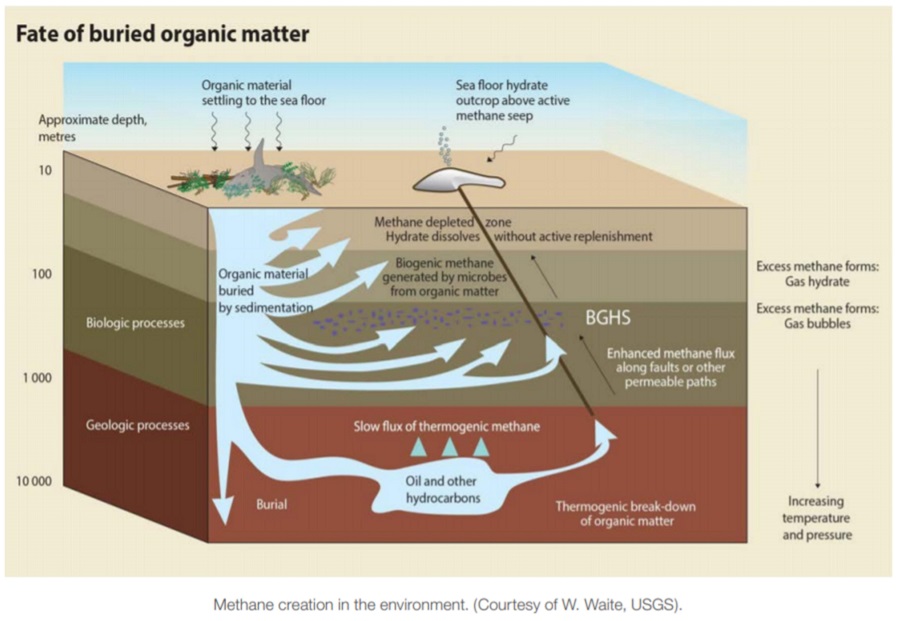 植物の堆積物や動物の死骸なんかの有機物が、地中に埋まって、地下の圧力と地熱によって、徐々に炭化水素物に変化して行き、ガスやなんかになって地層中を移動して行き、地層の形態によっては、石油になって溜まったり、天然ガスとして溜まったり、メタンハイドレートとして溜まったりする…、という話しのようだな…。
