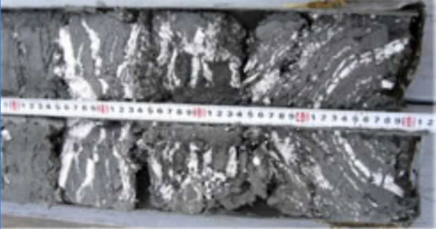こういう風に、垂直に縦坑を掘って、パイプを突き刺すやり方だと、ハイドレートの層が相当に厚みがあるものでないと、回収できる量が僅少で、なかなか商業ベースには乗りにくい…、と言う話しになってくる…。