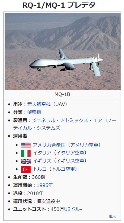 ※ 『主な任務は偵察やヘルファイアミサイルによる対地攻撃(武装型のMQ-1のみ)で、1995年の配備以降ボスニア(セルビア)、アフガニスタン、パキスタン、イラク、およびイエメンで作戦に参加している。