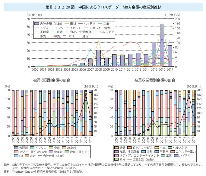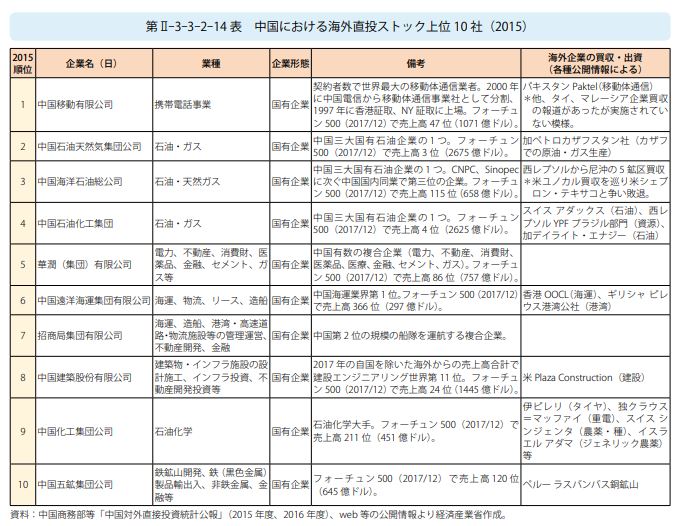 ※ 対外投資を、産業別に分析したものだ…。中国の対外投資と言うと、資源や食料…と言うイメージを、持っていたが、そうでも無いんだな…。むしろ、金融業や卸・小売業に多く投資している…。「その他サービス」って、何だろう…。「ウーバー」みたいな、新しいITと融合したベンチャー事業形態か…。情報通信や、不動産の割合が低いのは、ちょっと意外だった…。