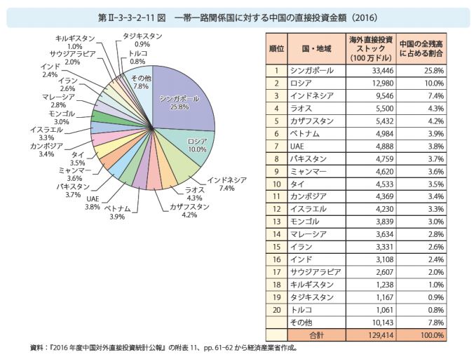 ※ シンガポールが、4分の1以上なのは、驚いた…。地政学的戦略からは、一帯一路というよりは、むしろ、マラッカ海峡封鎖に備える位置づけと思うが…。アジア金融のハブの一つなんで、投資しやすいと言うことも、あるんだろう…。ロシアは、1割か…。割合的には、それほどでもないな…。パキスタン、ミャンマーは、それほどでもないな…。この2国は、投資よりむしろ、ODAみたいな政府援助が中心なのか…。抜かりなく、カザフスタン、キルギスタン、タジキスタンの中央アジア諸国にも、投資しているな…。エネルギー資源確保(パイプライン確保)における、重要国だ。