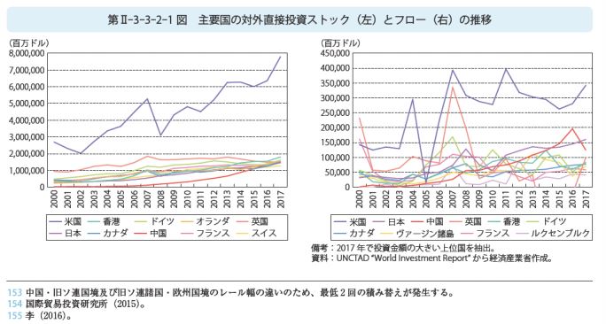 ※ 主要国の対外直接投資の推移だ…。米国のストックが、やはり凄いな…。世界から、資金を集めて、それを世界中に投資しているんだろう…。その米国のフローも、2004年から2005年にかけて、急激に減少しているのは、リーマンショックの影響だろう…。しかし、その後は、すばやく立ち直って、ダントツのフロー額を、維持しているな…。中国が、2007年から2009年にかけて、フローが急降下しているのは、なんかのショックがあったのか…。その後は、徐々に回復していたが2016年から、また下降しているな…。