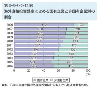 ※ 中国の対外直接投資の特徴の一つは、国有企業の占める割合が高いことだ。2006年には、8割もあった…。それが、徐々に減少して、非国有企業の占める割合が高まって行き、2015年には、ほぼ半々くらいになったんだが、2016年には、また、国有企業の比率が高まっているな…。民間企業の資金繰りに、変調が生じたということか…。