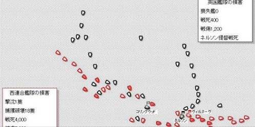 大体、「鶴翼の陣」は、相手を両翼が包み込んで、挟み撃ちにして、敵を殲滅する…、という「陣形」なんだが、ネルソン・タッチで「二重の縦深」陣形なんで、うまく包み込めず、また、仏・西連合艦隊は、操船にも難があって、うまく行かなかったようだ…。