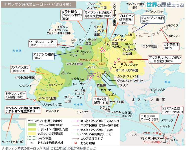 ※ 1812年頃のヨーロッパの様子だ…。各地で戦いが繰り広げられ、ジブラルタルの近辺で行われた、「トラファルガーの海戦」(1805年)が、ネルソン提督の名を一躍有名にした、一大海戦だったわけだ…。