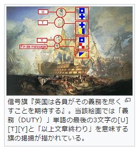 その時掲げられたとされる「信号旗」。「DUTY(義務)」と読むらしい…。日本軍なら、「各自奮励努力せよ!」だな…。