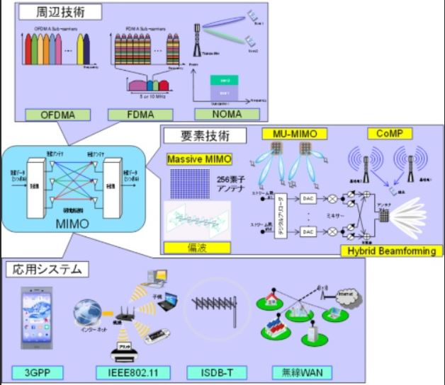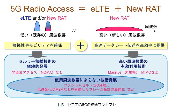 上記は、「ドコモ」がどういう風に5Gに対応しようとしているのかの「コンセプト」を表すものだ。LTEは、既存の4Gの方式だ。eLTEとは、「拡大LTE」と言うことだろう。RATはRadio Access Technology のようだ。前に、FDMAのところで、ある波の中に、別の波の「部分」を埋め込んで伝送し、受信する際に「取り出して」「結合する」ということを語ったが、ここでも、既存のLTEの波の中に、新しい5Gの波の部分を埋め込んで伝送する…、というようなことを考えているんだろう…。
