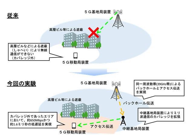 5G基地局からのミリ波が、高層ビル等で遮蔽される場合、中継基地を設置し、そこを中継して伝送しようと言うものだ…。