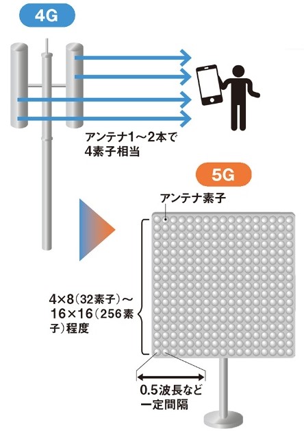 その電波の発生させる部分(送信部分)を、拡大して4Gと5Gで比較したのが、この図だ。