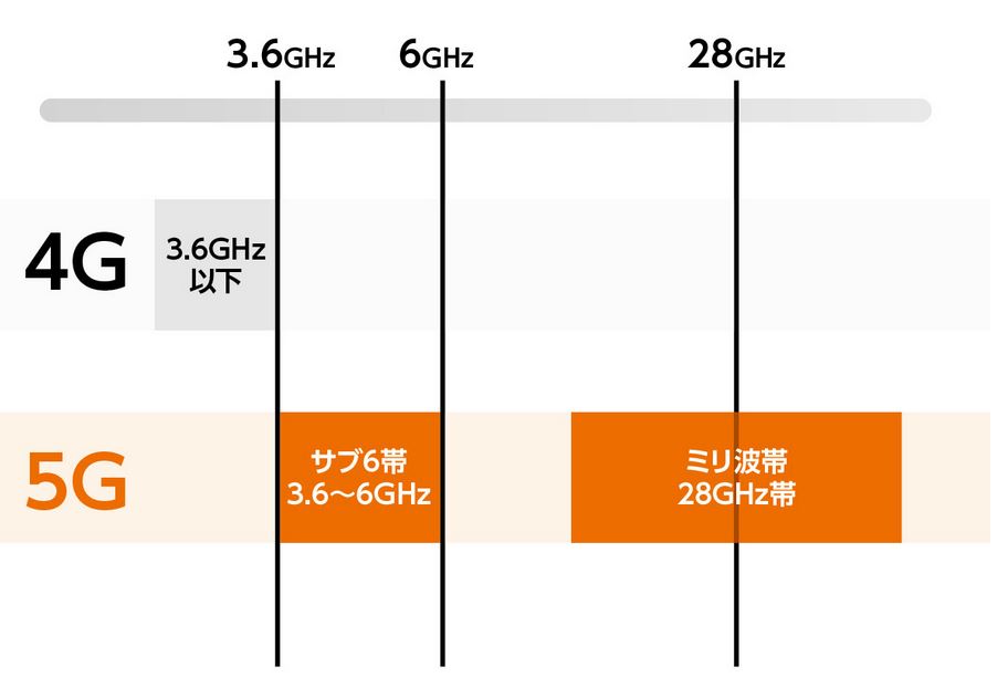 4Gと5Gとで、使う周波数帯を比較したものが上記の図だ。5Gでは、「ミリ波」と呼ばれる28GHz帯の電波も、使用する…。ちょっと前に、各携帯キャリアに割り当てられた話しがニュースにもなったから、記憶している人もいるだろう…。