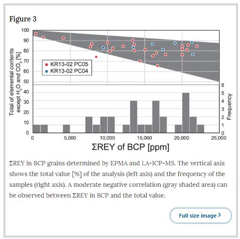 『3 EPMAおよびLA-ICP-MSによって決定されたBCP粒子のΣREY。縦軸は、分析の合計値[%](左軸)とサンプルの頻度(右軸)を示しています。BCPのΣREYと合計値の間には、中程度の負の相関(灰色の網掛け部分)が見られます。』