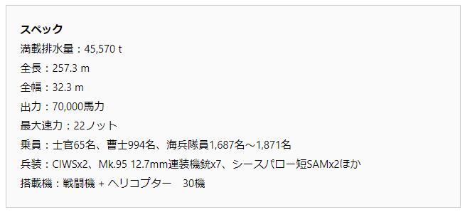サン・アントニオ級ドック型輸送揚陸艦 ( https://ja.wikipedia.org/wiki/%E3%82%B5%E3%83%B3%E3%83%BB%E3%82%A2%E3%83%B3%E3%83%88%E3%83%8B%E3%82%AA%E7%B4%9A%E3%83%89%E3%83%83%E3%82%AF%E5%9E%8B%E8%BC%B8%E9%80%81%E6%8F%9A%E9%99%B8%E8%89%A6 ) 『設計にあたっては、アメリカ海軍の揚陸艦として初めてステルス性への配慮が導入された。特にマストについては周囲が八角柱に近い構造のパネルにより覆われた先進型閉囲マスト/センサーとなっており、外部からのレーダー波を反射し、自艦の電波は透過するようになっている。前檣の頂部ドームにはAN/SPQ-9B低空警戒レーダー、本体内にはAN/SPS-73(V)13対水上捜索レーダーが、また後檣にはAN/SPS-48E3次元レーダーが装備される[2]。これらの配慮により、レーダー反射断面積(RCS)はオースティン級の1パーセント程度にまで低減されている[1]。』 『LPDはもともと強襲揚陸艦に近い性格を備えていた[3]ことから、本級も優れた航空運用能力を備えている。上部構造物の後端はハンガーとされており、MV-22Bティルトローターであれば2機、CH-46E輸送ヘリコプターであれば4機を収容できるほか、AV-8B垂直離着陸機の支援も可能である。また艦尾甲板はヘリコプター甲板とされており、発着スポット2個が設定されている。またヘリコプター甲板直下のウェルドックはオースティン級と同程度の面積であり、LCACであれば2隻、LCUであれば1隻、AAV7であれば14両を収容できる[1]。』 と言うようなものだ…。