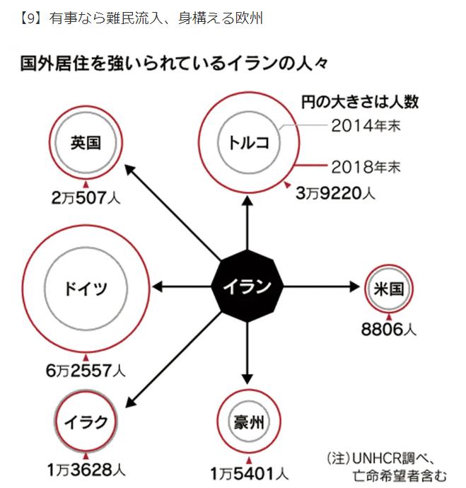 『2018年末時点で、自分の意思に反しイランを離れての居住を強いられている人は22万人弱。ドイツや英国が主な受け入れ先だ。』とある…。「自分の意思に反し」と言うことが、よく分からないな…。「現イランの体制に反対して、弾圧され、逃れた…。」と言うことか…。