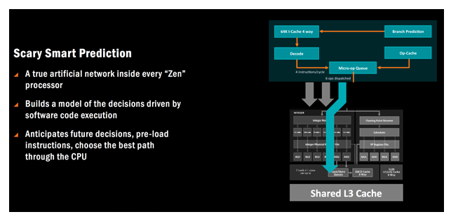簡単なGoogleは、パーセプトロンを利用した分岐予測子のアイデアはチップ設計において新しいものではないことを示唆していますが、これらのタイプの予測子は非常に正確なパフォーマンスを提供するように見えます。これは、どのCPUにとっても朗報です。AMDの従業員との私の会話は、今後のブリーフィングでこのトピックについてさらに学ぶことを示唆しているので、今のところピッチフォークに立ち向かうことができます。AMDはまた、Zenの「スマート」データプリフェッチャーを売り込んでいますが、CPUパフォーマンスのこの重要なコンポーネントを改善するために何をしているのかについては何も示唆していません。それについての説明も待つ必要があると思います。