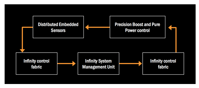 『SenseMIは、チップ間のばらつきを考慮しない所定の安全マージンで焼き付けるのではなく、動的電圧および周波数スケーリングカーブの最適なポイントで特定のRyzenチップを実行できるようにします。この適応技術により、チップはより低い電圧で特定の周波数で動作し、効率を向上させることができます。これはAMDが「ピュアパワー」と呼ぶ機能です。SenseMIは、ブーストクロックをダイヤルインするときに、所定のチップに潜在的な周波数オーバーヘッド全体を抽出させることもできます。これは、AMDが「プレシジョンブースト」と呼ぶものです。』