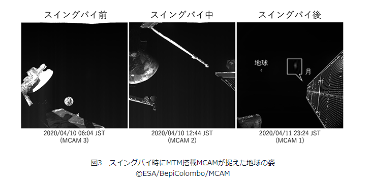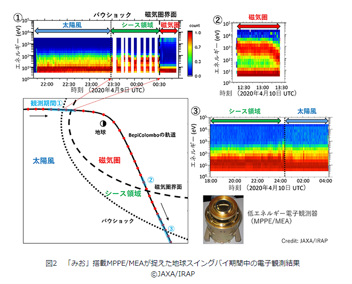 「みお」は、地球スイングバイにおいて、地球の重力を利用して目標どおり約5km/sの減速を行いながら、2020年4月10日(金)13時24分57秒(日本時間)に地球に最接近し、南大西洋上空の12,689kmを通過しました(図1)。ESA深宇宙ネットワーク局の探査機運用により、現在「みお」の状態は正常であることを確認しています。 「みお」に搭載した低エネルギー電子観測器(MPPE/MEA)によって太陽風および磁気圏の観測も行いました(図2)。2020年4月9日(木)22時~10日(金)1時頃(UTC)の観測結果からは、太陽風中から磁気圏へと入っていく様子がはっきり捉えられています。 また、地球スイングバイの前後では「ベピコロンボ」に搭載された多くの装置で観測が実施されました。電気推進モジュール(Mercury Transfer Module: MTM)に搭載されたモニタカメラ(MCAM)では美しい地球の姿が撮影されました(図3)。
