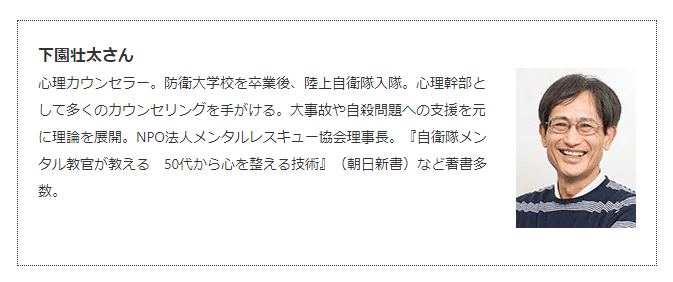 「コロナで不安」感情の正体は 元陸自心理教官の教え 元自衛隊心理教官の下園壮太さんに聞く(上)https://style.nikkei.com/article/DGXMZO59240950Y0A510C2000000?channel=DF140920160927