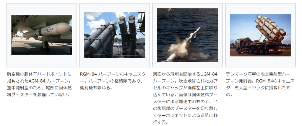 ・対水上戦:『本型は、90式艦対艦誘導弾(SSM-1B)による長距離対水上打撃力を備えている。SSM-1Bは1号型ミサイル艇で装備化された国産の艦対艦ミサイルで、従来使用されてきたハープーンよりも優れた精度と対妨害性を備えている。発射機はハープーンと同様の4連装発射筒で、2基の発射筒は、艦中央部、第1煙突後方に搭載されている。なお攻撃指揮装置としては対艦ミサイル艦上装置2形を備えており、SSM-1Bとハープーンの双方の発射管制機能を有している[22]。このため、実運用上はハープーンを搭載している例も多く見られる[23]。