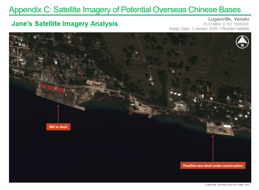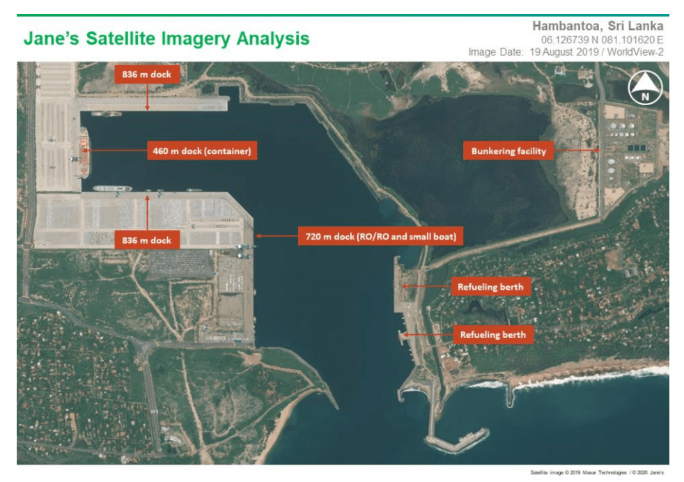 『ジェーンの分析は、多くあるいはこれらすべてのファシリティが内密の軍の備蓄を収容することがありそうもないという点で、ユンと Rustici のそれを支持します。 どんな前もって置かれた供給でも、兵器、軍需品、あるいは軍のプラットホームよりむしろ多分石油、石油、潤滑油を含めて、軍民両用可能品、食物と水、でしょう。 ジェーンのが同じく商用の港湾施設に対してのそれほど中国の投資を議論します - 特に BRI の一部として、たとえ港町自身が決して献身的な軍事施設の中に移行しないとしても - がにもかかわらずプラン活動の商業の補充サポートを可能にすることができました。 中国はそのロジスティクス model.109 に民間の組織、船と航空機を取り入れることを実験し始めました、そのために中国がノードとしてその軍の遠征のロジスティクスネットワークに海外の商業施設を取り入れることができたことはありそうです。