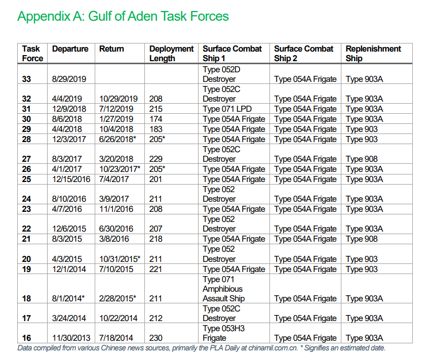 ※ この一覧表は、「タスクフォース」という単位についての、中身の説明のようだ…。「タスクフォース32」は、「出港が、2019年4月4日」「戻ったのが、2019年10月29日」「従事期間208日」「水面上の軍艦のタイプ」「補給艦のタイプ」なんてことを、解析しているようだ…。