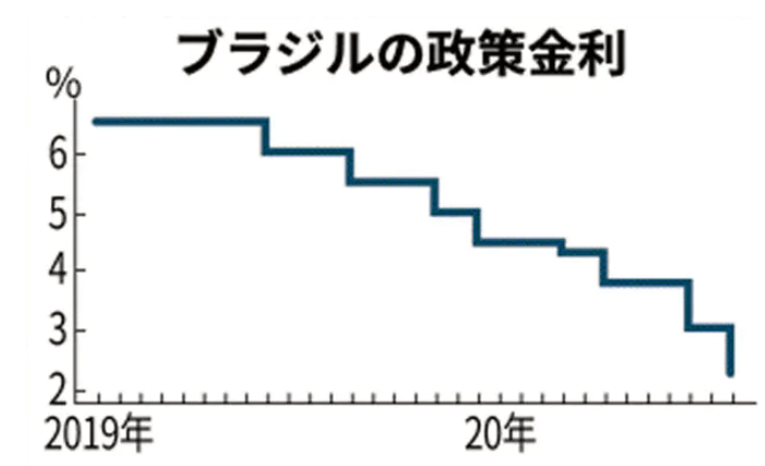 https://www.nikkei.com/article/DGXMZO60480390Y0A610C2EAF000/ブラジル、政策金利2.25%に 南米で過去最低相次ぐ