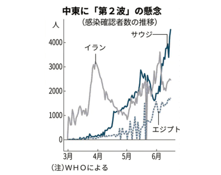 https://www.nikkei.com/article/DGXMZO60443430X10C20A6000000/中東に新型コロナ感染第2波、経済再開が裏目に