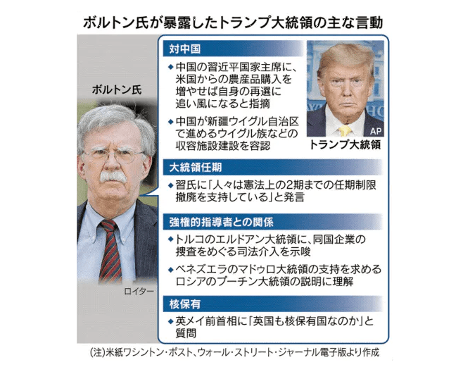 https://www.nikkei.com/article/DGXMZO60535120Z10C20A6000000/「トランプ氏、国益より再選」 ボルトン氏暴露本