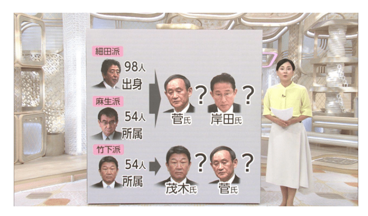 安倍サイドにあえて立候補を期待する向きもあった野田聖子には、支持の広がりが見られず、20人の推薦人の確保は絶望的だと見られている。安倍に近い細田派の議員は「数人(の推薦人)を野田に貸せば出られるという状況ではない。それに昔の派閥とは異なり、今や派閥領袖といえども所属議員に『野田の推薦人になってやれ』と無理強いできる時代ではない」と解説する。