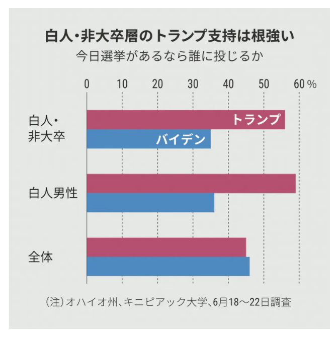 米キニピアック大の6月の世論調査では、オハイオ州でトランプ氏支持が45%、バイデン氏46%と拮抗する。同州の民主党支部の元代表は「世論調査の結果は少なくとも5ポイントをトランプ氏に加算すべきだ。浮かれてはいけない」と隠れトランプ支持者に警戒する。実際、労働者に多い白人・非大卒に絞ると56%がトランプ氏支持で、バイデン氏の35%を引き離す。同州の民主党支持者、マーク・マクベイさんは「(事前に民主優勢と言われた)16年の状況と似ているのが恐ろしい」と話す。