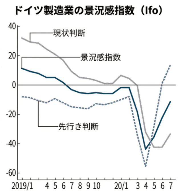 慎重さと楽観の併存は独Ifo経済研究所の景況感指数にも表れる。ドイツ製造業の7月の指数は3カ月連続の改善でマイナス12となった。4月のマイナス44と比べれば大きく回復しているが、危機前の水準にはまだ達していない。