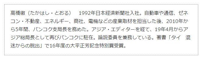ただし、辞任した7月16日は、プラユット政権発足からちょうど1年の節目だった。あえてこの日を選び、辞めさせられる前に辞めたことで、与党内の利権争いの「被害者」の立場を印象づけたのは間違いない。コロナによる経済危機のさなか、空白を承知で職責を投げ出した学者らしからぬ振る舞いは、なお将来の政界復帰の野心を秘めているからなのだろうか。』