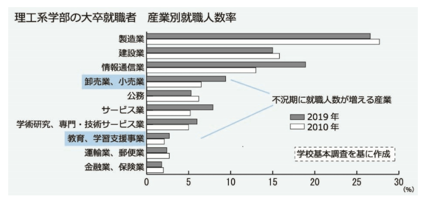 不況期に就職率が高まった就職先には「卸売業・小売業」と「教育・学習支援業」がある。つまりスーパーマーケットや学習塾産業だ。ここに含まれる多くは「アルバイト先への就職」と推察される。就活に疲れた学生が、企業の面接に嫌気がさし、アルバイト先にそのまま就職したというわけだ。私自身は小売業出身であり、業界を差別するつもりはない。ただ、言葉を選ばずに言えば、理工系学生の多くが自ら進んで選ぶ職場かと考えると疑問だ。