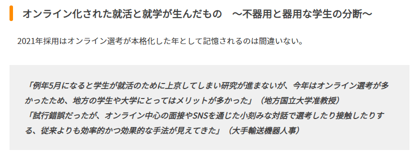 ごく一部の取り組みを、さも全体のように伝えるのは企業人事の悪い癖の一つだろう。オンライン化された就活と就学が生んだもの ~不器用と器用な学生の分断~