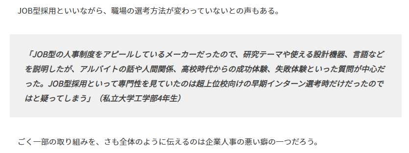 「JOB型の人事制度をアピールしているメーカーだったので、研究テーマや使える設計機器、言語などを説明したが、アルバイトの話や人間関係、高校時代からの成功体験、失敗体験といった質問が中心だった。JOB型採用といって専門性を見ていたのは超上位校向けの早期インターン選考時だけだったのではと疑ってしまう」(私立大学工学部4年生)