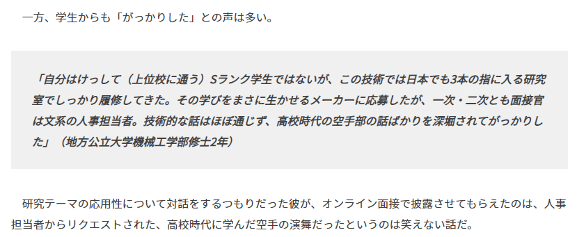 一方、学生からも「がっかりした」との声は多い。「自分はけっして(上位校に通う)Sランク学生ではないが、この技術では日本でも3本の指に入る研究室でしっかり履修してきた。その学びをまさに生かせるメーカーに応募したが、一次・二次とも面接官は文系の人事担当者。技術的な話はほぼ通じず、高校時代の空手部の話ばかりを深堀されてがっかりした」(地方公立大学機械工学部修士2年)