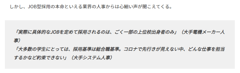 「実際に具体的なJOBを定めて採用されるのは、ごく一部の上位校出身者のみ」(大手電機メーカー人事)
