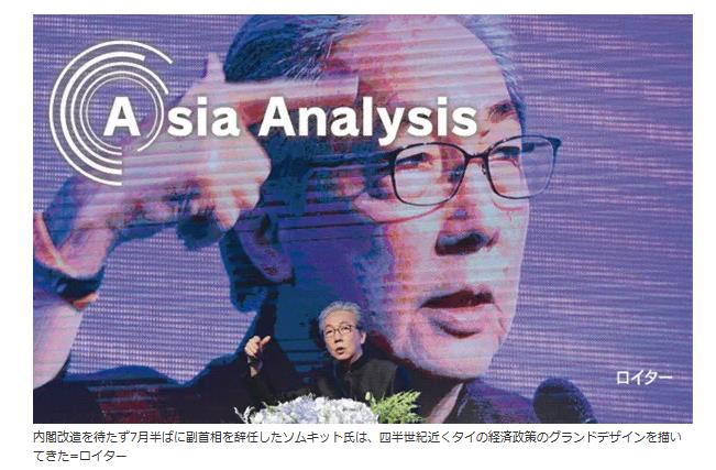 「今の経済チームの仕事ぶりが物足りないなら、居座るべきではない。だが何をしていいのか分からないなら、代わりのチームは来るべきではない」。6月に内閣改造観測が浮上しても、ソムキット氏は続投へ強気だった。ところが与党内の内紛も絡み、包囲網は徐々に狭まる。7月に入ると「私は年を取った。何年も前にもう意欲をなくした」と諦観した発言が漏れた。辞任はその6日後だった。辞任会見に自身は姿を見せず、腹心のウッタマ氏が「健康上の理由」と説明した。5年間を2度、計10年にわたって副首相を務め、タイ経済の針路図を描いてきた重鎮にしては、寂しい去り際だった。