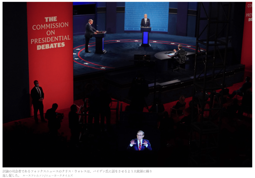 討論の司会者であるフォックスニュースのクリス・ウォレスは、バイデン氏に話をさせるよう大統領に繰り返し促した。