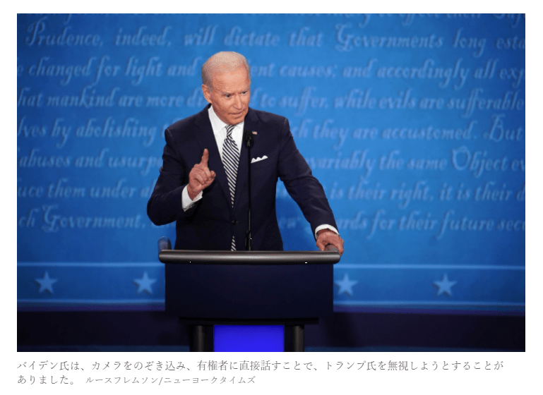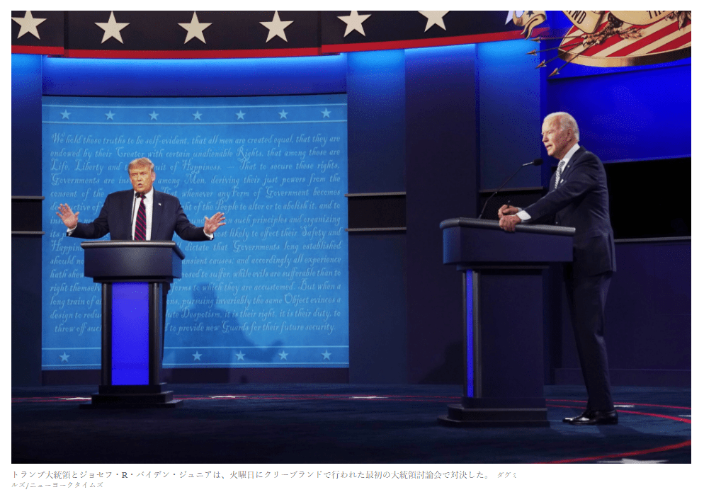 クロストーク、嘘と嘲笑で、トランプはバイデンとの議論でデコラムを踏みにじる トランプ大統領は、ジョー・バイデンが話すたびに中断し、スウィング有権者に彼のリーダーシップについて安心させる試みをほとんどしませんでした。バイデン氏は反論した。「これはとても非大統領的です。」https://www.nytimes.com/2020/09/29/us/politics/trump-biden-debate.html