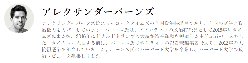 アレクサンダーバーンズは、ドナルドトランプの2016年のキャンペーンを含む、全国の選挙と政治権力をカバーする全国的な政治特派員です。2015年にタイムズに来る前に、彼はポリティコの2012年大統領選挙をカバーしました。@alexburnsNYT