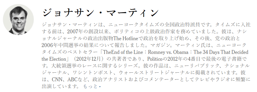 ジョナサン・マーティンは全国的な政治特派員です。彼は、2016年の大統領選挙、いくつかの州および議会のレースなど、さまざまなトピックについて報告し、スポーツ、食品、書評にも寄稿しています。彼はCNNの政治アナリストでもあります。@jmartnyt
