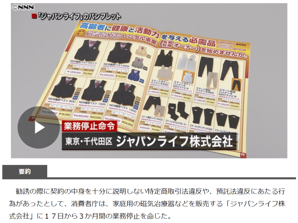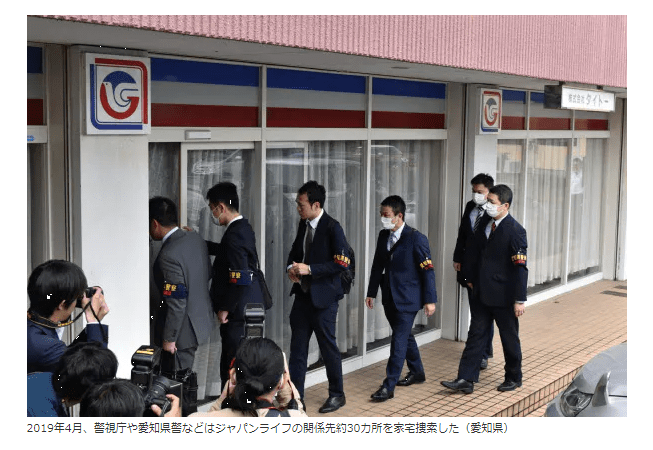 被害者からの相談を受け、警視庁と愛知、秋田、福島、埼玉、岡山の6都県警は19年2月に合同捜査本部を設置。同年4月にはジャパンライフの財務状況が悪化していることを隠して顧客と契約したとして、特定商取引法違反(事実の不告知)容疑で同社の関係先約30カ所を家宅捜索した。』