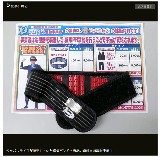 ※『具体的には、ベストやネックレスに磁石を埋め込んだものを「磁気治療器」と名付け、そのオーナーになれば元本が保証される上、レンタル収入によって年に6%の配当金を得られるとして、高齢者を中心に全国から出資を募っていました。』