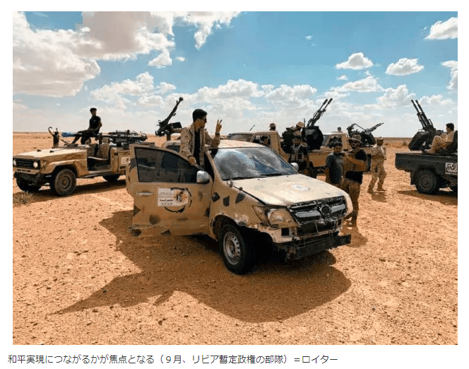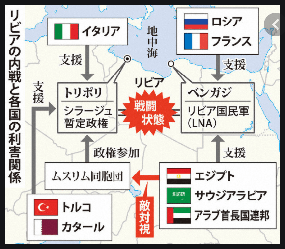 北アフリカの産油国リビアは事実上、東西に分裂。西部の首都トリポリを拠点とするシラージュ暫定政権がトルコなどの支援を受け、東部の有力軍事組織、リビア国民軍(LNA)と衝突を繰り返してきた。LNAはロシアやエジプトなどが支える。外国の介入で事態は複雑になっている。