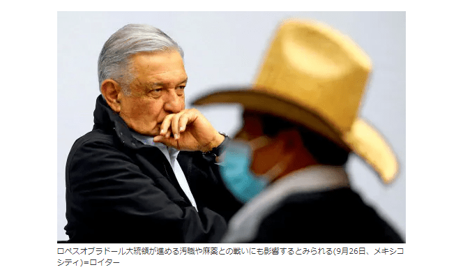 ロペスオブラドール大統領が進める汚職や麻薬との戦いにも影響するとみられる(9月26日、メキシコシティ)=ロイター