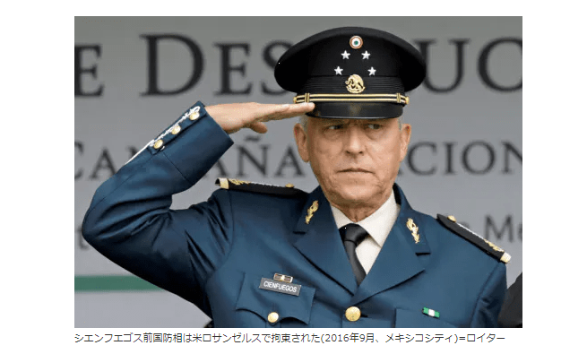 シエンフエゴス前国防相は15日、家族とともに米ロサンゼルスの空港に到着したところ、米麻薬取締局(DEA)の令状で拘束された。2015年12月から17年2月の間に、コカインやヘロイン、覚醒剤やマリフアナなどの米国への密輸に関与したというのが拘束の理由だ。取引の規模は数千キロに達するという。