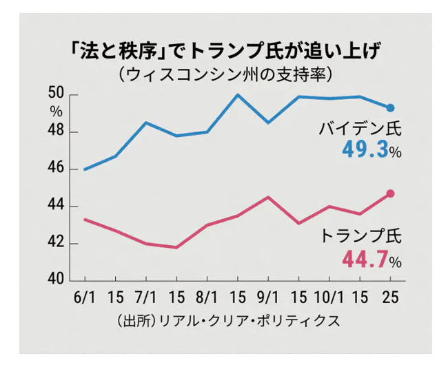 米大統領選は、ラストベルト(さびた工業地帯)の東部ペンシルベニア州など10州あまりが激戦州と呼ばれる。なかでもウィスコンシン州は、トランプ氏が16年に得票率0.7ポイントの僅差で制し、大統領の座をつかむ一因となった。政治サイト、リアル・クリア・ポリティクスによると、バイデン氏はウィスコンシン州でトランプ氏に4.6ポイントのリードをつける。トランプ氏は治安強化を意味する「法と秩序」のスローガンで巻き返しを図る。