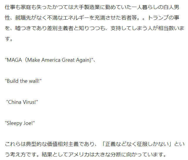 ※ だから、そもそも社会とやらが「分断」されて、社会全体が達成すべき目標・目的という「価値観・価値判断」が共有されていないならば、そこに行われている「多数決」は、意味をもたないことになる…。